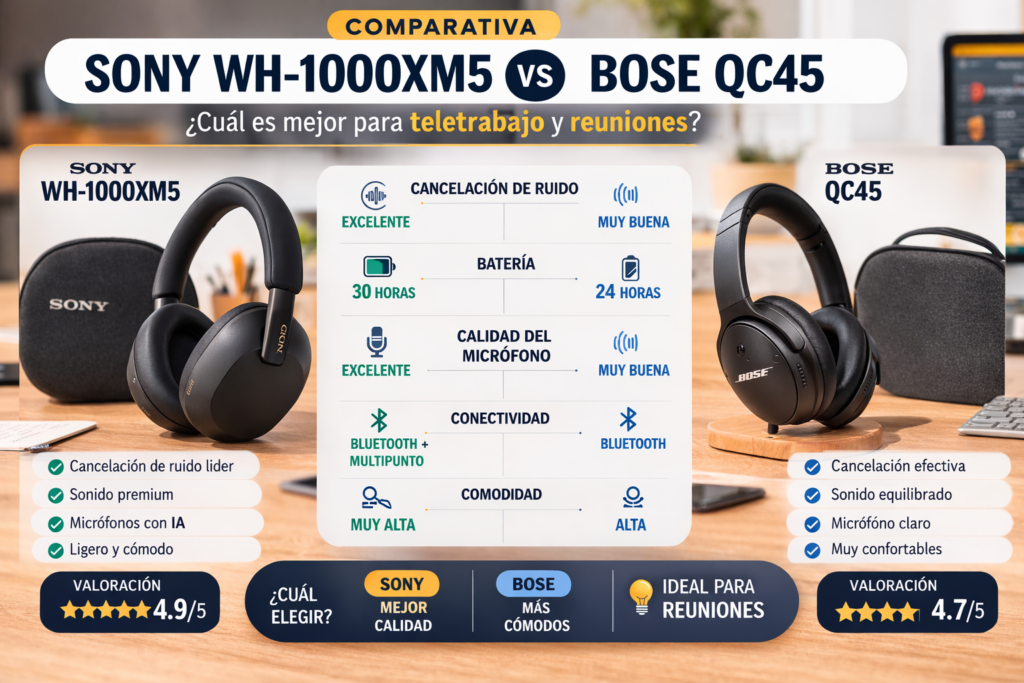 En esta comparativa Sony WH-1000XM5 vs Bose QC45 analizamos en detalle cancelación de ruido, calidad de micrófono, comodidad, batería y precio para que puedas decidir cuál es el mejor para tu forma de teletrabajar.